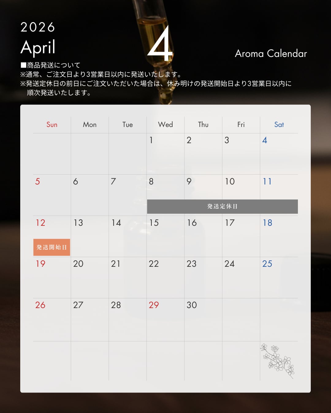 ※発送定休日の前日にご注文いただいた場合は、休み明けの発送開始日より3営業日以内に順次発送いたします。